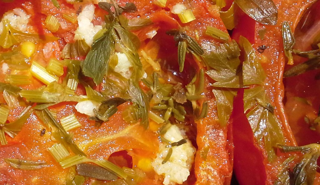 - Baisser le feu, parsemer chaque demi tomate d’ail écrasé au presse ail, de thym et de sarriette.