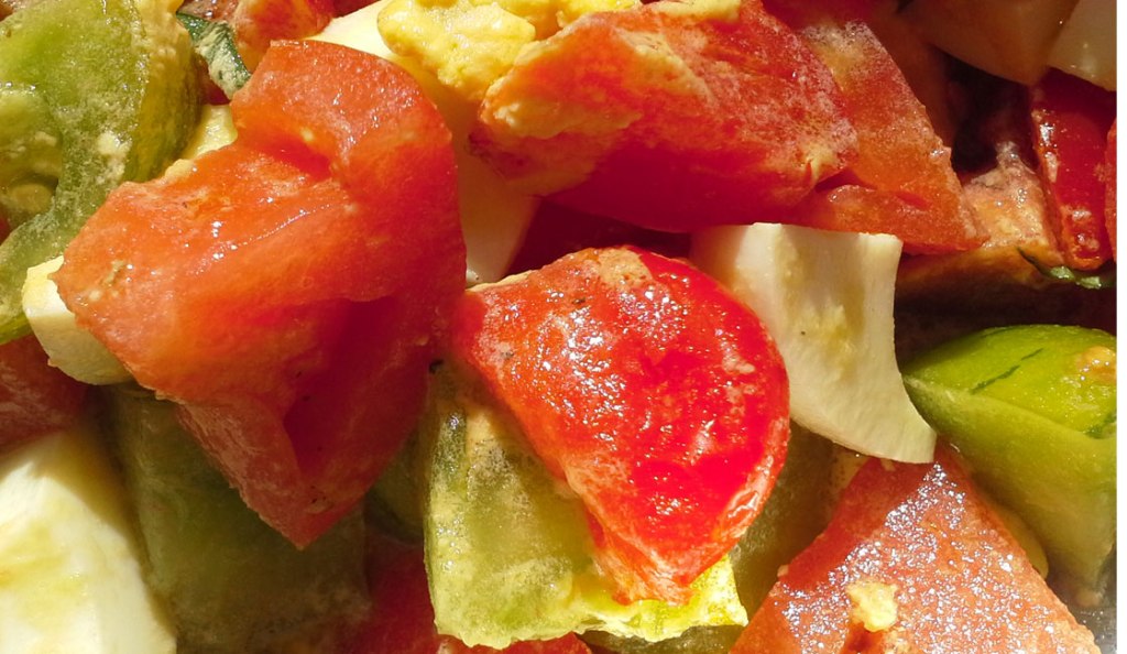 - Mélanger dans un saladier avec le basilic, l’huile, le vinaigre, le sel.