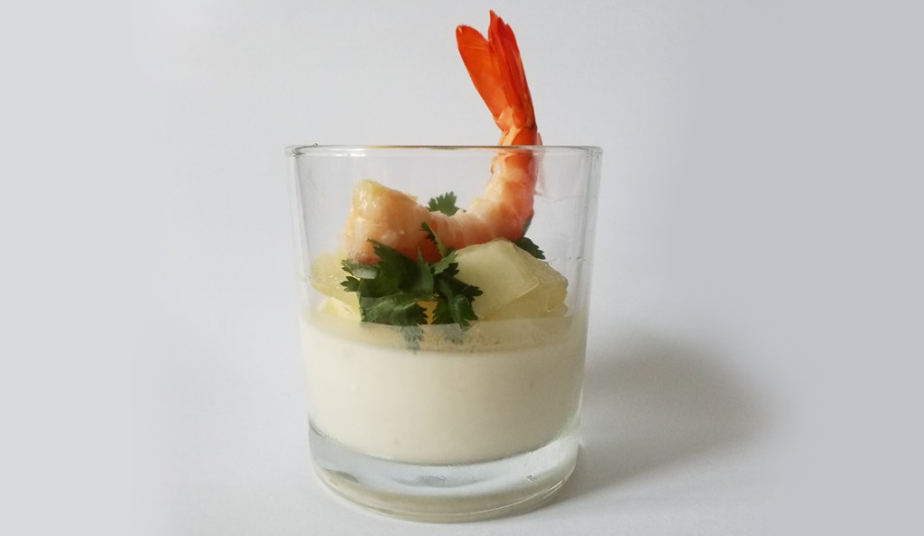 - Dans chaque verrine, disposer des cubes de melon sur la pannacotta, verser 1/4 cc de marinade, déposer une crevette et parsemer de pluches de coriandre.