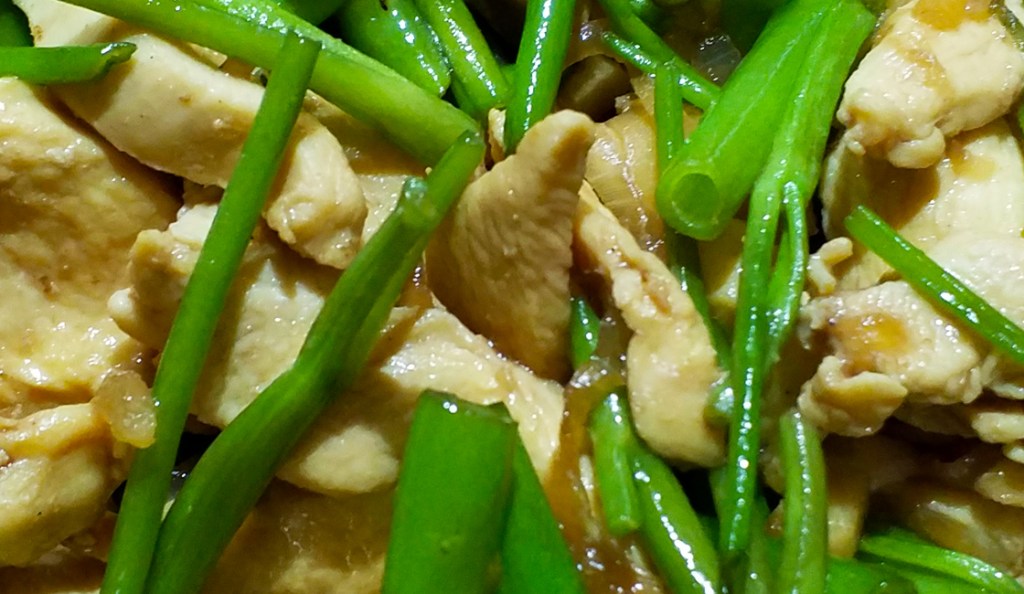 - Au moment de servir, mettre l’huile à chauffer dans un wok, y faire revenir la viande, l’ail et l’oignon jusqu’à ce que le poulet commence à dorer.