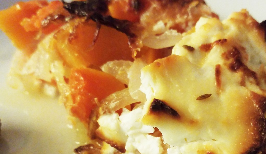 - Faire une seconde superposition de couches : dés de sucrine, oignons, cumin et poivre, puis verser la crème fraîche et parsemer d’emmental.