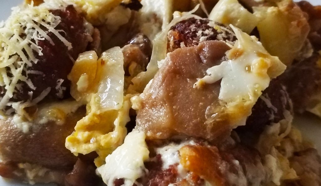 - Dans un plat à gratin, verser les champignons, disposer les boulettes et casser les œufs dans des alvéoles faites à la cuillère.