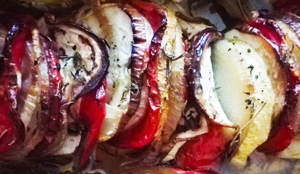 - Dans un plat à four, disposer en rangs serrés les légumes en alternant aubergine, oignon, tomate et courgette.