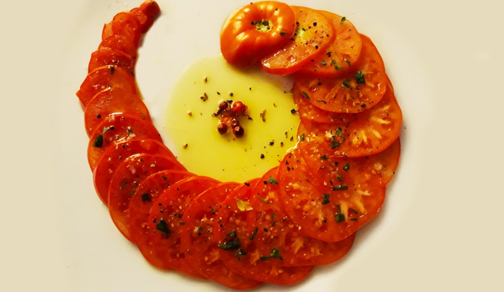 - À l’aide d’un couteau très aiguisé, couper la tomate en lamelles de 1 mm d’épaisseur en commençant par la pointe.