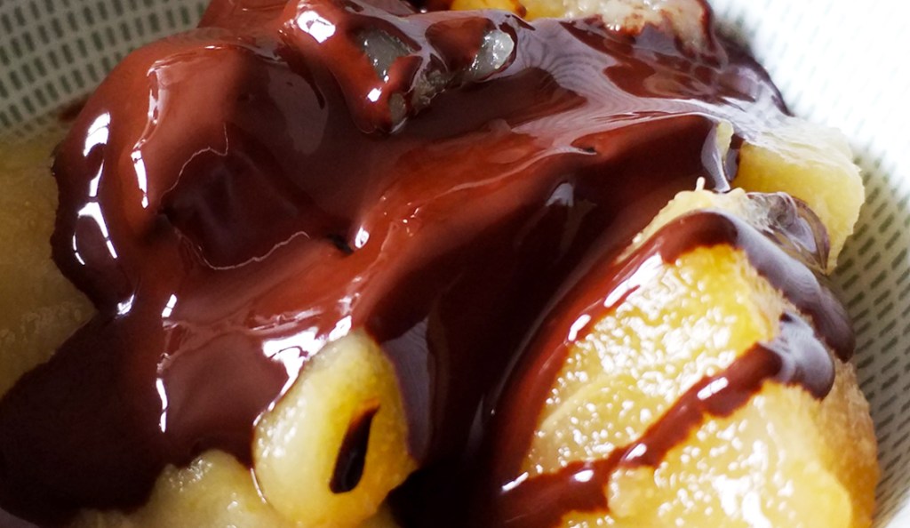 - Servir la compote sans écraser les fruits, verser le chocolat fondu.