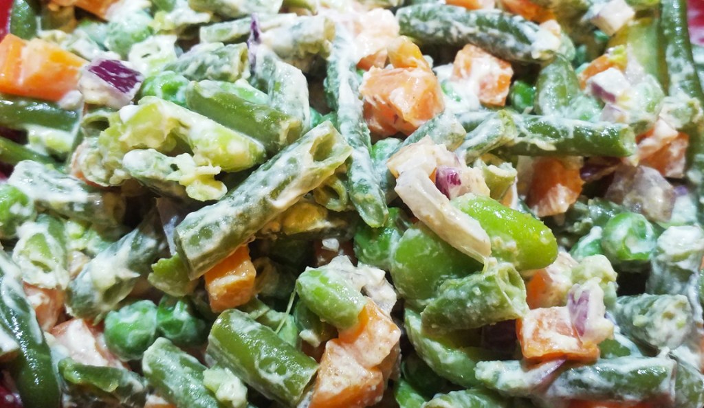 - Dans un saladier, verser les légumes cuits et l’oignon rouge, ajouter la mayonnaise, poivrer et bien mélanger.